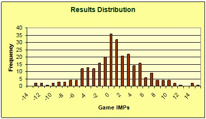 Best Result: +15.02 IMPs (Game 79) Worst Result: -13.73 IMPs (Game 71) Most Common Result: Between 0 and +1 IMP (36 occurrences)