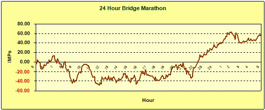 And, the doctor says, "Well, why don't you turn him in?" Well I need the IMPs. 11h45 pm: Wife heads off to bed, I am alone again. 1h46 am: We reach our top score of the session: +62.44 IMPs. 2 am: Decide to donate some money to charity for every hour I manage. A charity that will hopefully provide me some medical care. 3h30 am: Wife reappears and offers to make me a cup of tea! I insist she goes back to sleep instead. 3h46 am: I'm in my last hour now. Trouble is the opponents are very good. We're +45.08 IMPs and my partner has just proudly boasted of having once lost 100 IMPs with ease in a single session of her Bridge career. This is not good for my morale. Still by being very careful we not only don't lose IMPs we even start gaining them. 4 am: This is an evil time of day - too late for some things and too early for others. Only Faron Young could be comfortable at this hour - as proven by his rendition of "It's Four In The Morning". I mention this fact to the table. Although they're all from the US they've never heard of him. Doh! 4h39 am: It's down to the last two games now and I have my long promised Scotch. Despite my partner's skill we're going to end on a plus - surely noone can lose over 45 IMPs in two games? 4h51 am: Done! I feel I could play some more but decide it would be wise to go to bed instead. Final score is +58.52 IMPs after 269 games. AftermathI hadn't felt particularly sleepy during the session even at the end. After it was over I went to bed at 5am but was wide awake after only 3 hours sleep. The rest of the day I felt pretty normal (i.e. wrecked) except at 9pm I really did have to sleep. I noticed my first and index fingers were swollen from typing and clicking, but this passed after a few hours. I did slouch a lot and a couple of days later I suffered a seriously aching back as a result. After checking the scores I conclude that I didn't get worse as the day wore on, although with changing partners and opponents this is hard to tell. The worst moment of inattention happpened early in the session, after about 7 hours, when I opened 1NT having failed to count my hand of 21 points correctly. I did do something for charity from it: for every hour I played I made a donation to CARE International an international relief and development agency that helps find lasting solutions to poverty. Would I play for 24 hours again? No way. SummaryHere are the stats: Start: 27th December 2005 04h49 Finish: 28th December 2005 04h51 Games Played: 269 Overall Score: +58.52 IMPs Cumulative Score: